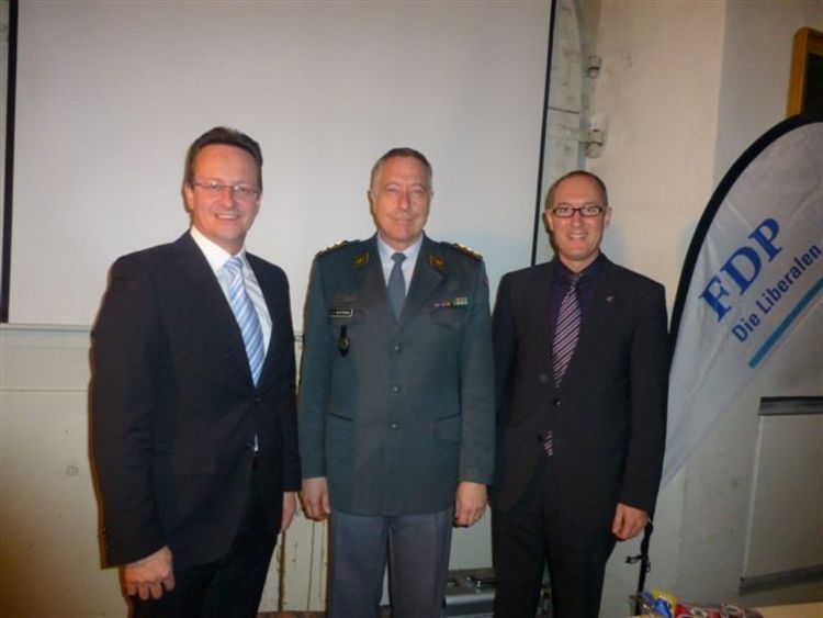 Als Höhepunkt des diesjährigen FDP Neujahrs-Apéros referierte unter dem Titel Wert der Sicherheit – Auf dem Weg zu mehr Ehrlichkeit der Chef der Armee, Korpskommandant André Blattmann. Für ihn als Armeechef stehe an vorderster Stelle die Eigenverantwortung für die Sicherheit von Land und Leute. In Anspielung auf die im Bundesparlament gemachten Aeusserungen betreffend einer freiwilligen Miliz oder Berufsarmee, meint Blattmann, dass das heutige, bewährte System schlagkräftiger und effizienter sei, als wenn man für eine teurer Berufs- oder sogenannte freiwilligen Armee eine weitere finanzielle Umverteilung durch den Staat vornehmen müsste. Er zeigte auch die eindrücklichen Zahlen der Entwicklung der Ausgaben für die Landesverteidigung von 1850 bis 2012 auf, deren Resultat aktuell bei 4,7 Mrd (inkl. 300 Mio für Tiger-Teil-Ersatz TTE). Anhand eindrücklicher Schaubilder zeigte er auch das weltweite aktuelle Gefahrenpotential, sprich Risiken und Bedrohungen, auf in den Bereichen Katastrophen, Krisen, Konflikte/Kriege auf. Dass das man vom höchsten Militär auch Aussagen zur Beschaffung des Flugzeuges Grippen erwartete, war den zahlreich erschienenen FDP-ler klar. Er stellt richtig, dass die Evaluation und die Prozesse korrekt abgelaufen seien. Politisch gesehen sei unbestritten, dass beiden Staaten, die Schweiz und Schweden das Abkommen über die Flugzeugbeschaffung wollen. Der Kaufpreis sei nicht entscheidend gewesen, sondern die Betriebskosten, die bei den andern Varianten ein Risiko gewesen seien. Technisch gesehen, werde der Saab-Grippen mit dem neuesten Radarsystem, den neuesten Lenkwaffen, den neuesten Triebwerden ausgerüstet. Er sei der festen Ueberzeugung, dass der Grippen die beste Lösung sei. Auch die kommende Wehrpflichtabstimmung hätte weitreichende Konsequenzen und würde bei einer allfälligen Annahme das System Schweiz grundlegend auf den Kopf stellen. Es gebe, so Blattmann, keine Alternative zum bewährten Milizsystem und erwähnt das Stichwort „Solidarität des Bürgers in Uniform für seine Heimat". Andere Staaten würden die Schweiz beneiden. Zum Schluss seiner Auslegeordnung von Armee und Sicherheit bedankte sich der Armeechef bei allen, sei es als Angehöriger der Armee, Arbeitgeben und Angehöriger. Sie alle würden damit ihren Beitrag zur Sicherheit des Landes leisten, direkt oder indirekt.