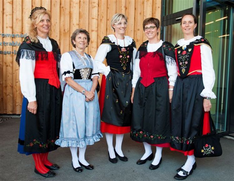Foto: O.Item Bildlegenede (von links n. rechts): Anna-Margreth Holzinger-Lorez, Schiers: Prättigauer Festtagstracht Brigitta Hitz-Rusch, Churwalden: Innerrhoder Tracht Leta Steck-Rauch, Strada: Unterengadiner Sonntagstracht Susanne Krättli-Lori, Malans: Herrschäftler Festtagstracht Annamarie Perl-Kaiser, Pontresina: Engadiner Sonntagstracht