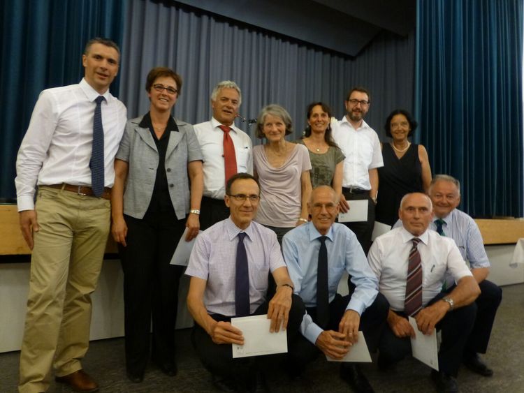 Fraktionspräsident Ruedi Kunz flankiert von den Abtretenden (v.l.n.r): Susanne Krättli, Hans Peter Michel. Maria Meyer-Grass, Annamarie Perl, Jann Hartmann, Lukrezia Furrer, Duri Bezzola (unten), Reto Nick, Jakob Barandun, Giagten Peder Fontana. (Nicht im Bild: Urs Zweifel und Jachen Bezzola)